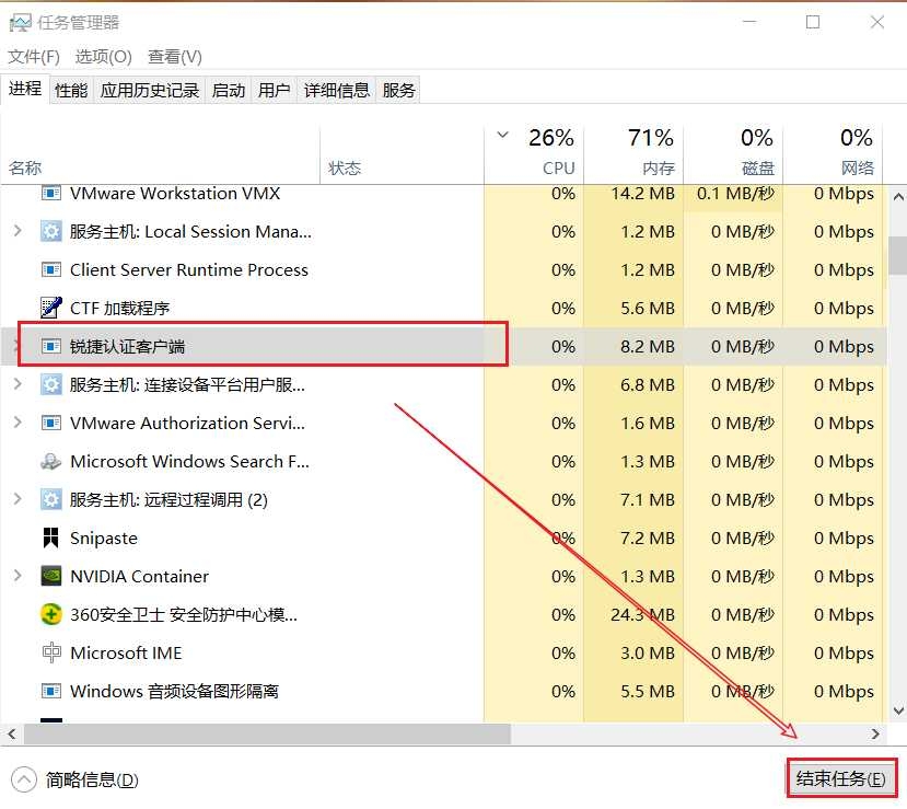断开锐捷校园网连接,然后在任务管理器中关闭锐捷的后台和服务