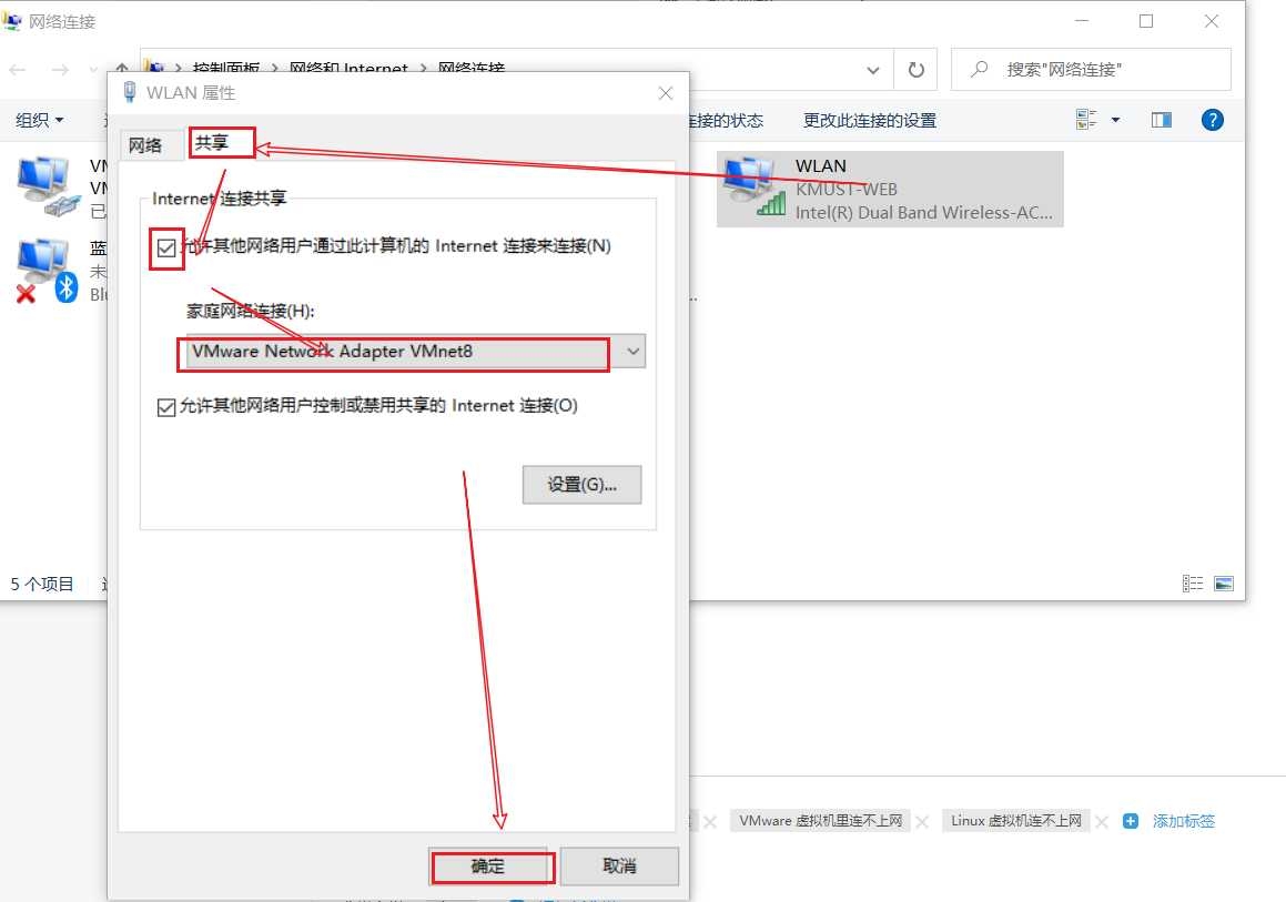找到自己现在连接的网络,右键→属性→共享→勾选允许其他网络连接→将虚拟机的NAT网络 VM8共享连接到该网络 保存